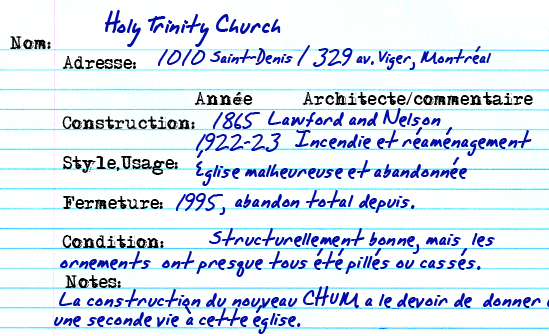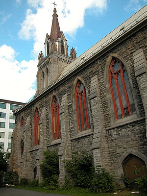 Déjà en 2000, lors de mes balades photo du quartier Latin, j'avais remarqué la solitude de cette église. Peut-être qu'à l'époque, l'annonce d'un projet de conversion possiblement en un restaurant Piazzetta a eu une certaine influence sur le regard que je portais sur les bâtiments du secteur ( il me semble que Mitsou avait un lien dans le projet). J'ai alors commencé à porter attention aux vieux bâtiments du coin. J'ai suivi la décrépitude lente de l'endroit quotidiennement ; à tous les jours sur mon chemin vers le travail je me demandais si un jour il serait possible de faire une visite. J'espérais que les squeegees ne l'aient pas trop endommagée, et qu'elle soit belle comme au premier jour.