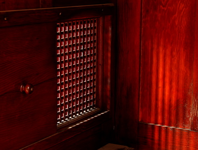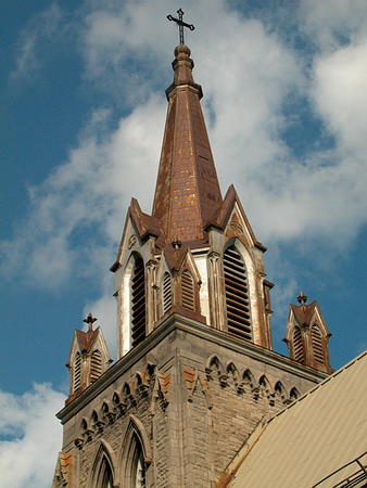 Ensuite: mais où est passé tout l'aménagement du sous-sol! Pourquoi le revêtement du plancher a-t-il disparu? Enfin, le plafond et le plancher ne semblent pas concorder. Au sol se trouvent de longues planches de 25' de longueur constituées d'un tronc d'arbre simplement coupé en deux, ceux-ci déposé sur un fond en terre. Ce genre de sous-plancher et structure est typique du 19e siècle, mais le plafond lui n'a rien avoir avec ces vieilles poutres. La structure supportant le rez-de-chaussée est constituée de larges madriers bien alignés et tous de dimensions égales. De plus, des colonnes et poutres d'acier renforcent la structure au centre de l'église. Ce que je ne savais pas à ce moment, c'est que l'église Holy Trinity Church fut vendu à la communauté Syrienne en 1922, devenant alors l'Église Saint-Sauveur. Qu'elle passa au feu la même année avant même la première cérémonie. Des travaux furent par la suite entrepris pour reconstruire l'église: remplacer la toiture d'ardoise, la flèche du clocher, l'orgue, les bancs, les vitraux, tout ! Ce que nous pouvons encore voir de l'église n'a plus rien avoir avec son état d'origine. D'où la nette différence entre les larges troncs d'arbres du sous-sol et le plancher du rez-de-chaussée.