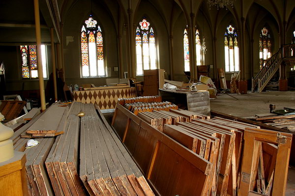 Il est a noté que même si le feu n'avait pas eut lieux, nous n'aurions pus voir un intérieur d'église intègre, car avec le déménagement de la communauté anglicane, le lutrin, le pupitre, la chaire ; cadeaux d'officiers anglais, de même que les vitraux du choeur et l'autel partirent avec la communauté. Il est aujourd'hui impossible de retracer le transfert de ces éléments patrimoniaux importants. Les confessionnaux par contre sont sensés être 100% d'origine et si la tendance se maintien, un antiquaire viendra durant la nuit les chercher. Étrangement le seul confessional restant est en pin et les caissons sont de contre-plaqué de pin, des clous rond tiennent en place les moulures.... il fut remplacé comme tout le reste en 1923.