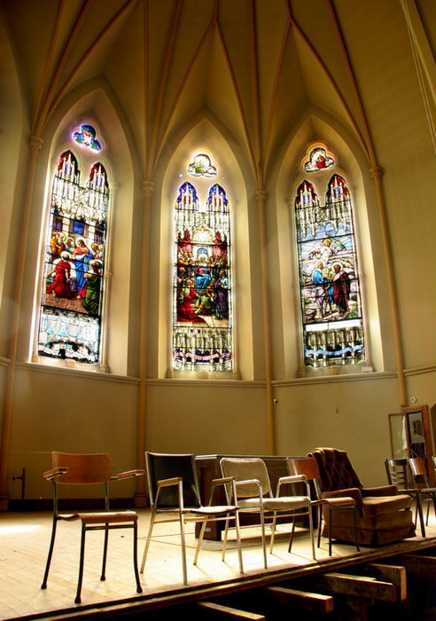 Faute de protection et préservation adéquate, des vandales ont décidé de se faire des petites gâteries en se prélevant des morceaux de vitraux. Certains ont même tenté en vain de démonter des parties de vitrail pour les reconstituer par après. Bandes d'idiots! un vitrail se démonte en grand panneaux! Il aurait été préférable de bien placarder l'endroit ou de vendre les vitraux à un antiquaire qui aurait pris soin de bien les enlever plutôt que qu'ils se fassent maladroitement amputer.