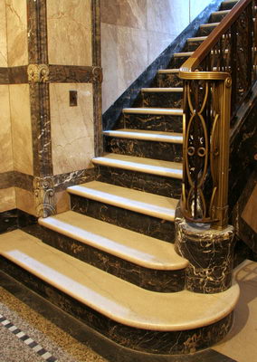 géométrique et incrustations de laiton, escalier en marbre avec rampes en