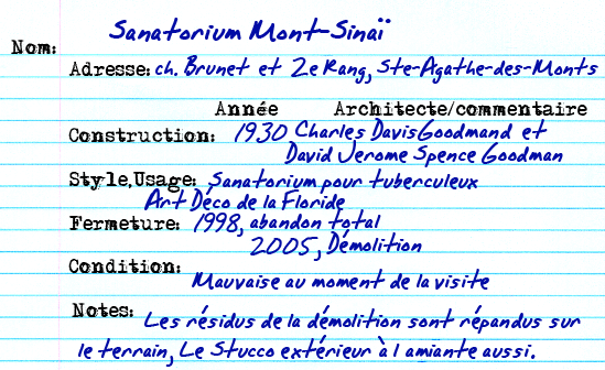 "La 15 nord, sortie centre-ville, après ça c'est à toi. " En plus de savoir de savoir qu'il y avait un Canadian Tire dans la ville et que l'endroit était dans les Laurentides, voici tout ce que j'avais pour trouver l'un des seuls et derniers sanatoriums du Québec, mais aussi le premier à avoir été inauguré. Il n'y a pas beaucoup de Canadian Tire dans les pays d'en haut, encore fallait-il trouver la bonne ville et me faire confirmer l'information: la chose ne fut pas trop compliquée, trouver l'emplacement exact par contre demanda plus de travail.